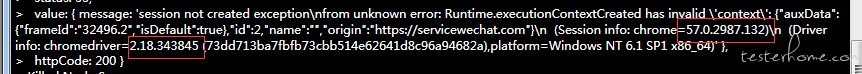 > value: { message: ‘session not created exception\nfrom unknown error: Runtime.executionContextCreated has invalid \‘context\‘: {"auxData":{"frameId":"32496.2","isDefault":true},"id":2,"name":"","origin":"https://servicewechat.com"}\n (Session info: chrome=57.0.2987.132)\n (Driver info: chromedriver=2.18.343845 (73dd713ba7fbfb73cbb514e62641d8c96a94682a),platform=Windows NT 6.1 SP1 x86_64)‘ },